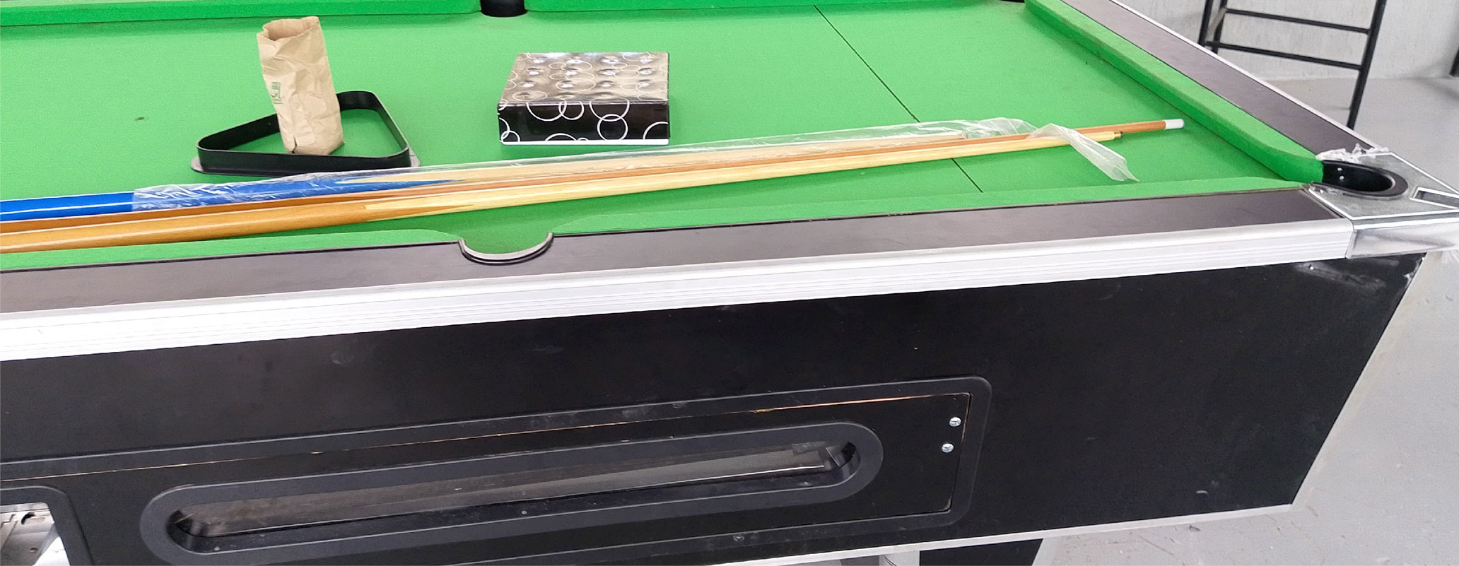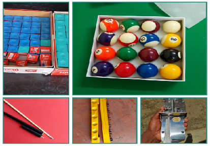 chalks, tips, triangle, pool operator coin machine installed,